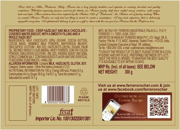 Whole hazelnut covered in milk chocolate. A creamy filling, a crunchy wafer and a delicious hazelnut centre;And thanks to its inimitable golden wrapper and paper cup Ferrero Rocher is even more unique and special